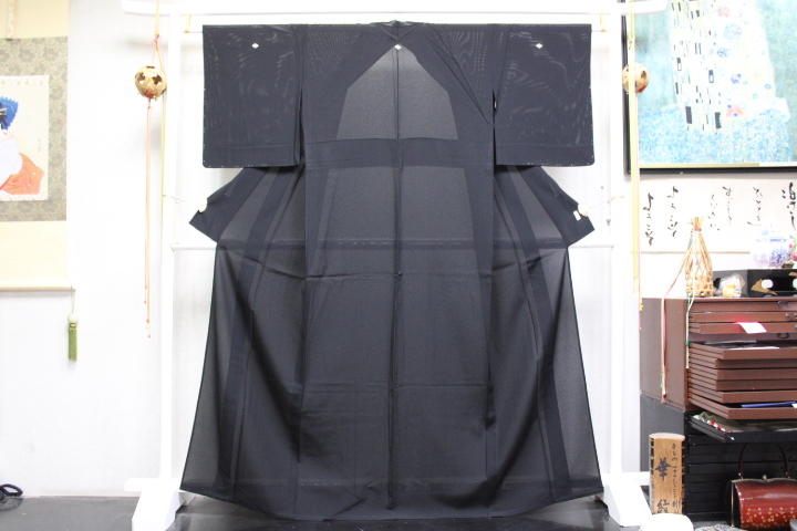 - きもの今昔8988 黒の礼装 単衣喪服きもの 正絹駒絽生地 車輪梅下「泥染」 シツケ糸付き未使用品 身丈164cm