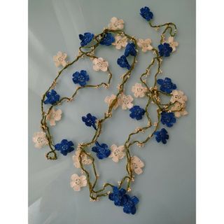 - r12-2 トルコ オヤ刺繍 ネックレス ラリエット 白ビーズ 青 フラワー刺繍