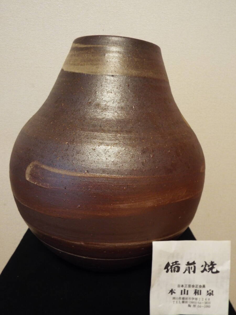 - 備前焼 壺 本山 和楽 共箱付(口径9,5×高さ34×幅32×cm、重量6kg)美品