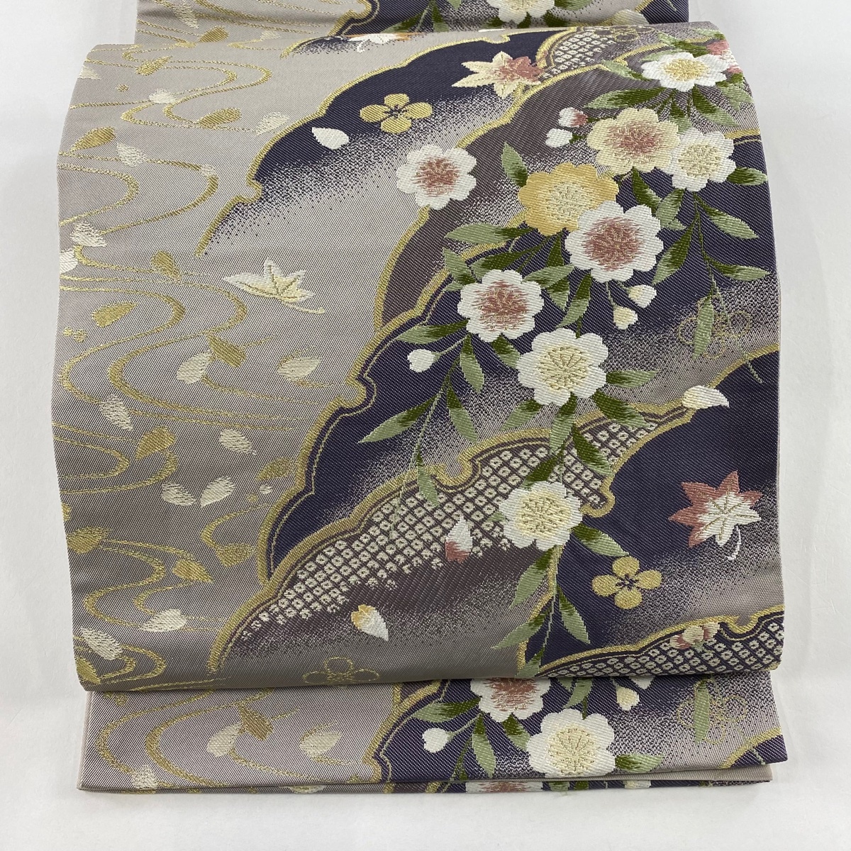 - 袋帯 名品 坂東三津五郎 落款 花布季 やまと 雪輪 桜 金糸 灰紫 六通 正絹 【中古】