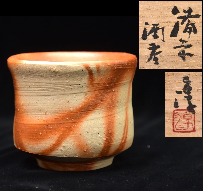 - 097 備前焼 人間国宝 伊勢崎淳 酒呑 緋襷● 酒器 ぐいみ 共箱 栞 日本酒 和食 和食器 皿 岡山県 料亭 陶芸家