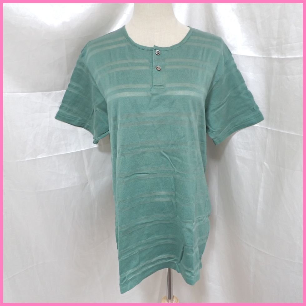 > ★イヴサンローラン ヘンリーネック シアーボーダー 半袖Tシャツ レディースL/グリーン/コットン100%&1577906661
