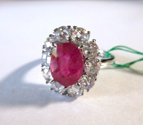 明るいピンクのルビーの周りにジルコニアが取り囲んでキラキラしています。ルビーはミルキーな透明感で柔らかなテリがあります。ルビーはPB加熱だと思います。