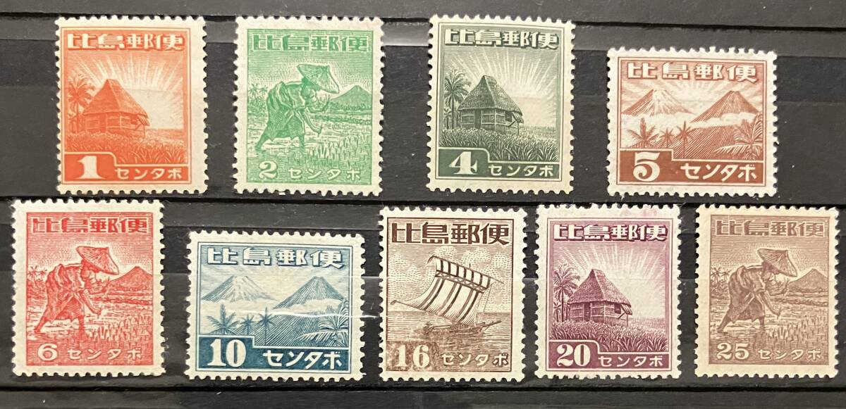 > 南方占領地切手 フィリピン 1、2、4、5 、6,10、16、20、25センタボ 9種 普通切手 1943年 折れ裏糊ヒンジ跡有る無 未使用
