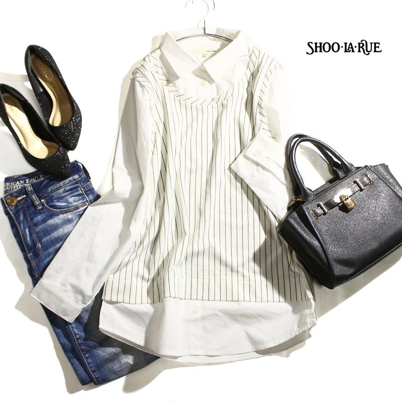 - 美品 シューラルー SHOO・LA・RUE 株) ワールド 合物 シャツ一体 フェイクレイヤード デザイン 長袖 カットソー M ホワイト 白 ブラック 黒