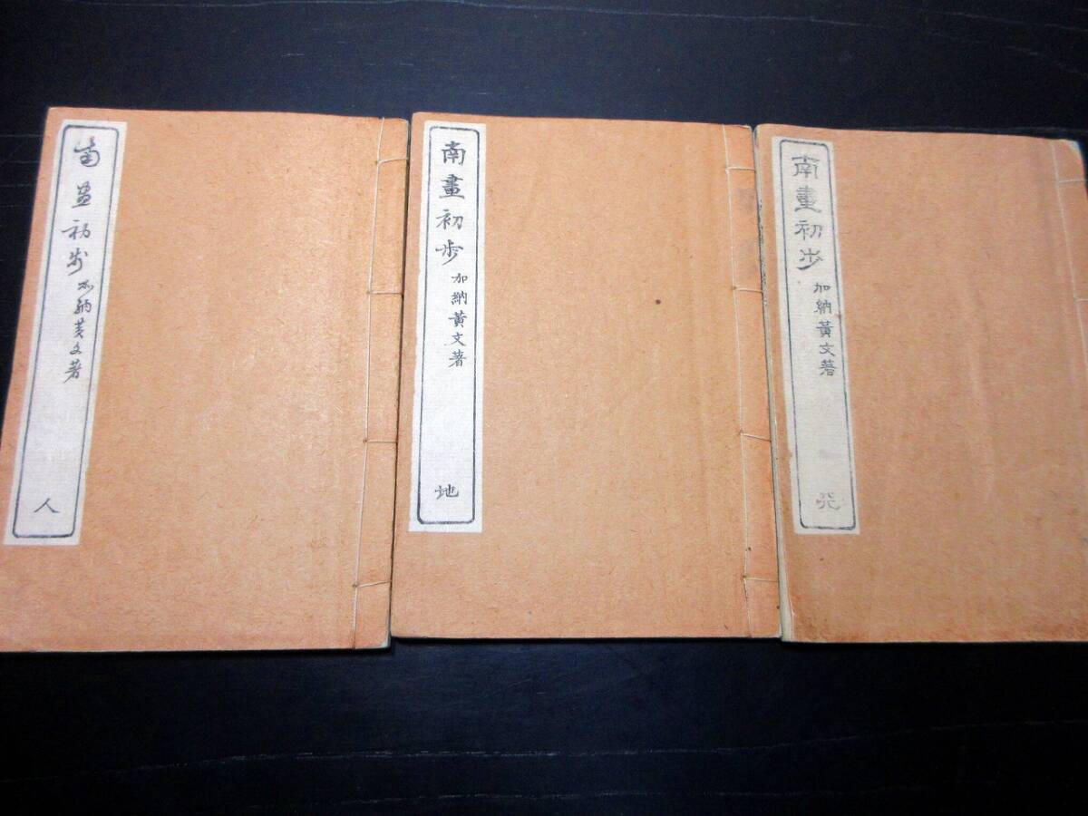 - ★S24和本明治44年(1911)絵手本「南画初歩」天地人3冊揃い/加納黄文/絵入古書古文書/木版摺り