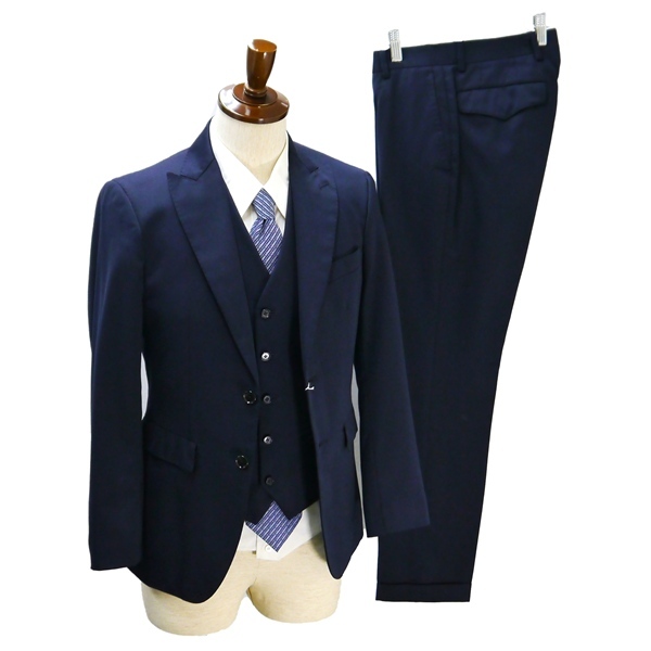 ・春秋冬対応。ベストあり(リバーシブルベスト:ダークネイビー、ダークグレー)。2つボタンシングル。背抜き。サイドベンツ。フラップポケット。ネーム刺繍なし。本切羽。