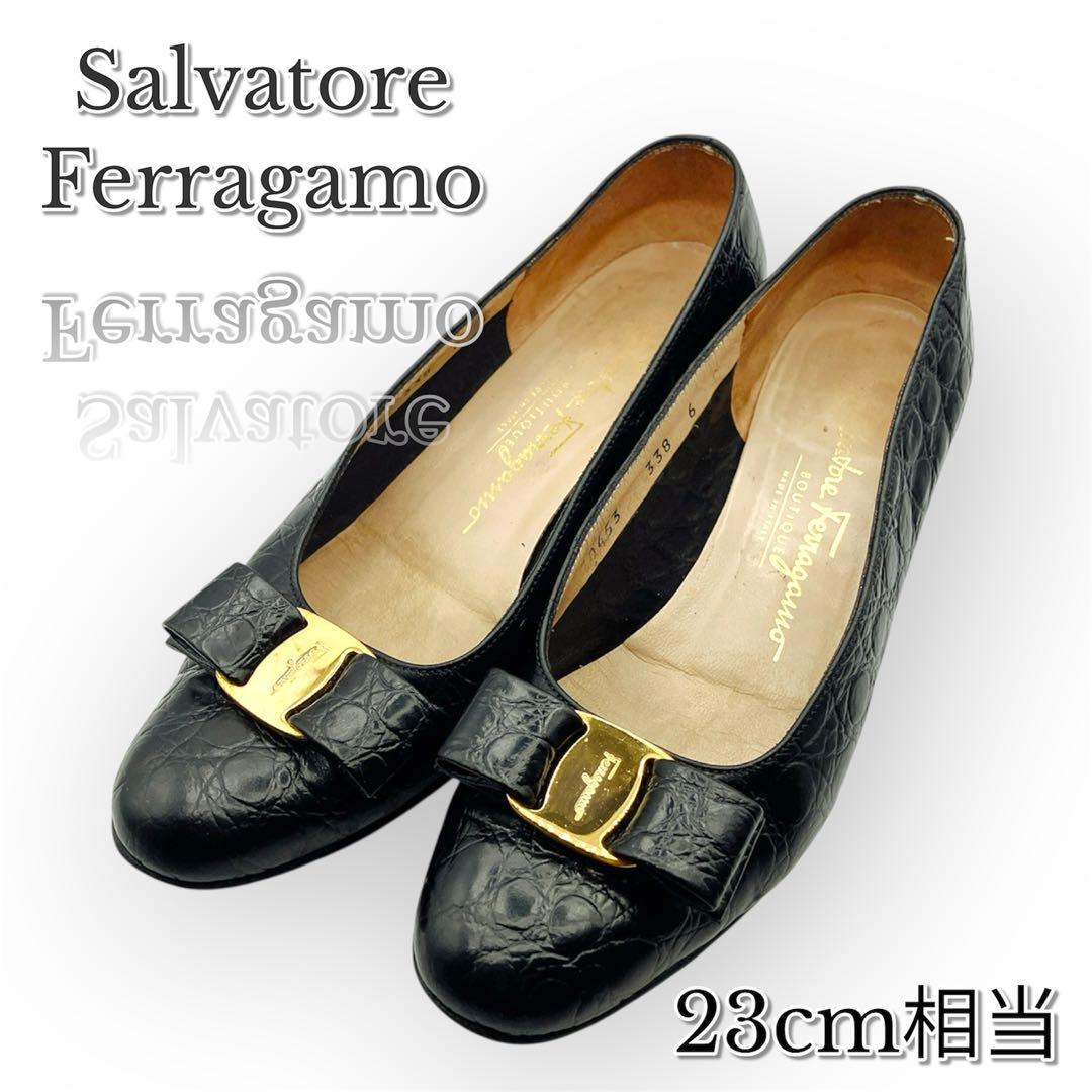 > FERRAGAMO フェラガモ パンプス ヒール 23cm クロコ型押し 黒 靴 4670 00530101