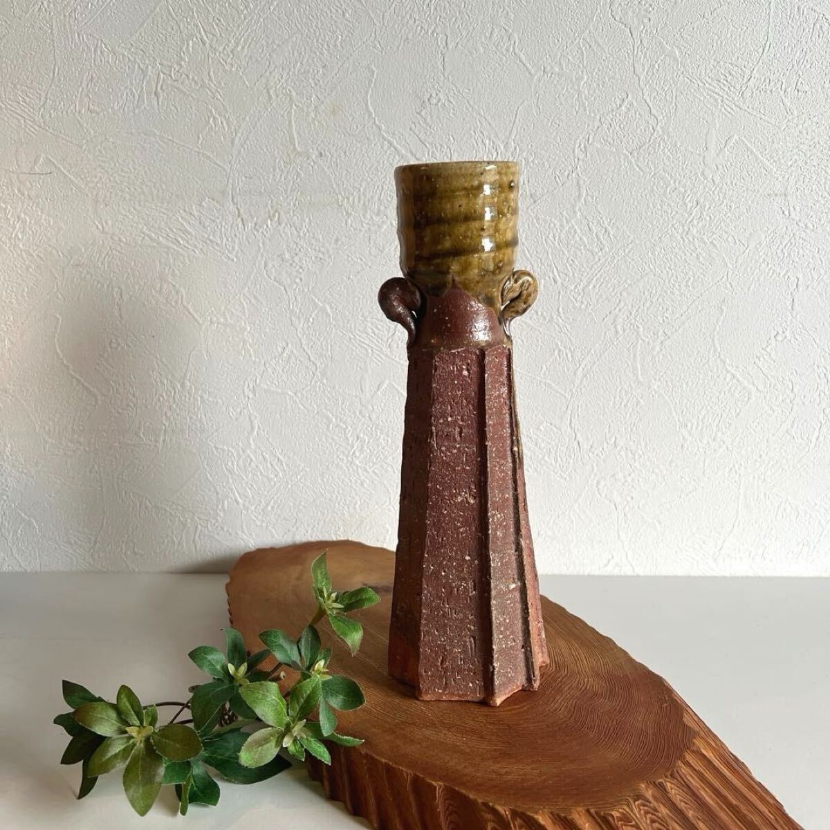 - wasabi k915 やきもの 耳付き花瓶 花入れ・花器・飾り壺 済斎 赤みがかった土の色合いと質感 プリーツのようなひだが特徴的な逸品 陶印あり