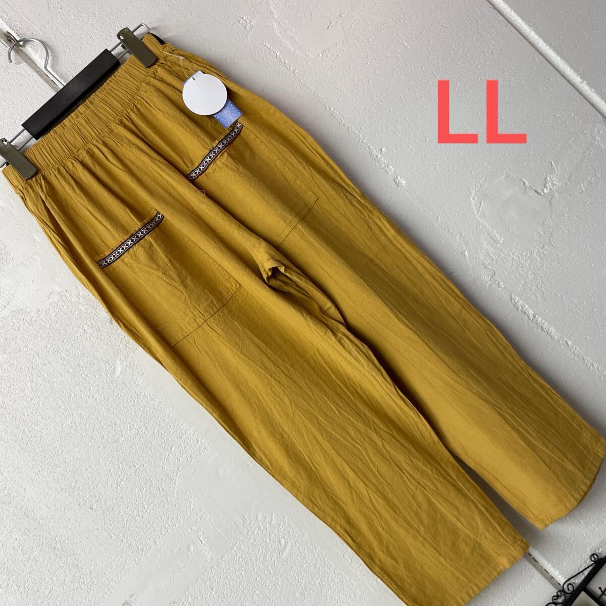 - LLサイズ綿100%ポケットテープ使いテーパードパンツマスタード