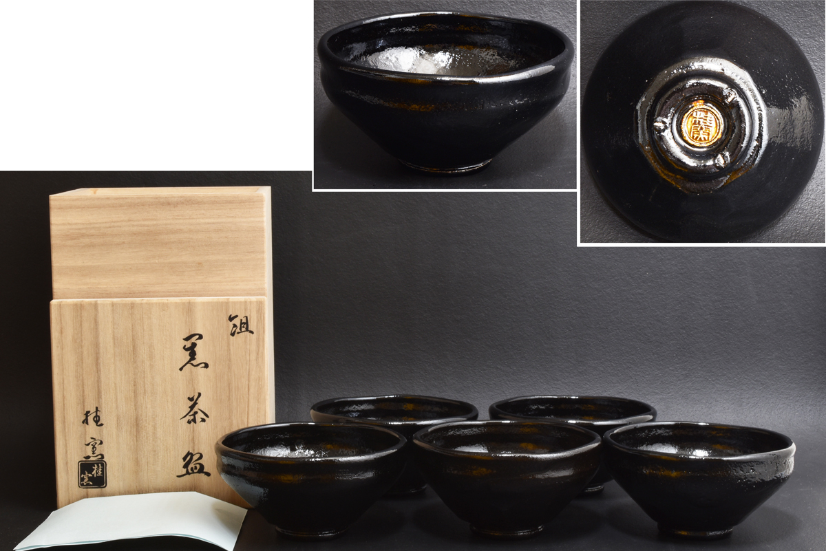 - 6051 桂窯 黒茶碗 天目形黒楽茶碗 5客 共箱