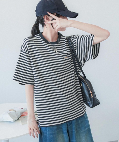 - 新品・未使用♪PENNEYS/ペニーズ / THE FOX ロゴ ワッペン刺繍ワンポイント テレコリブ ボーダー半袖リンガーTeeシャツ♪Mサイズ♪