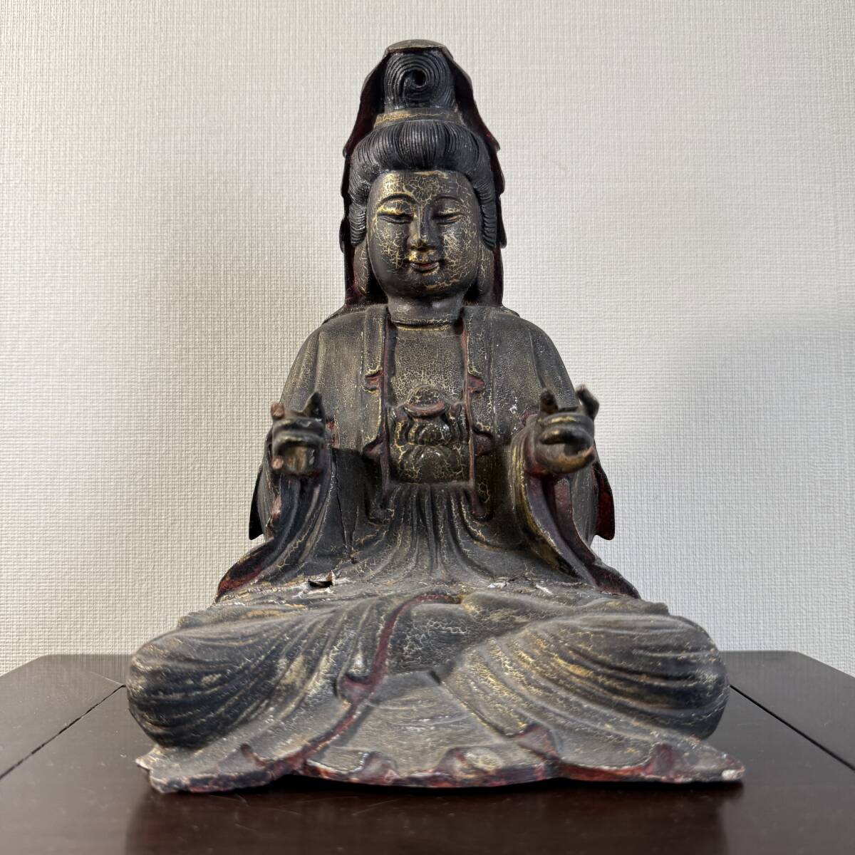 - 時代 中国美術 木彫 鍍金 朱漆 観音坐像 高さ22cm/ 仏教美術 唐物 鍍金仏 金銅仏 仏像 古美術 骨董 古玩 置物 密教 大仏 金彩 清朝 明朝