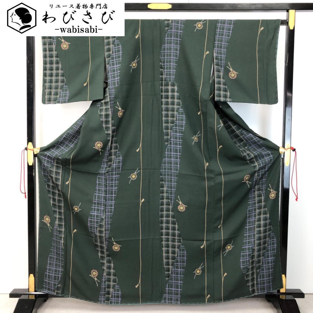 - 小紋 縦柄 丸に花模様 組紐 黒緑色 しつけ糸 ガード加工 K-5286 着物 きもの kimono 和服 和装 中古 リサイクル着物 【送料無料】