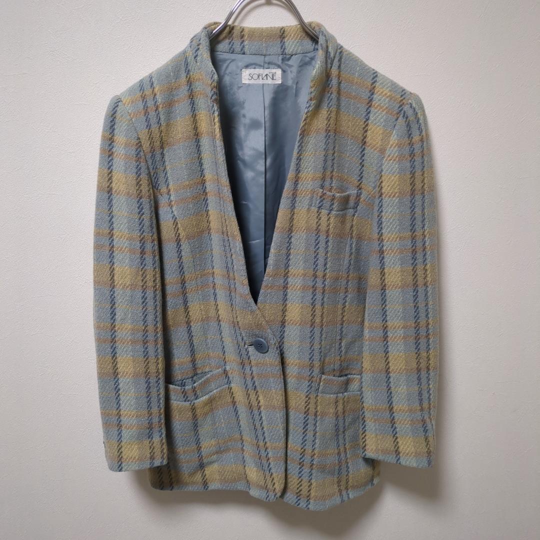 - 【美品】SOFLINE(7R)ノーカラージャケット*チェック*Vネック*レトロ