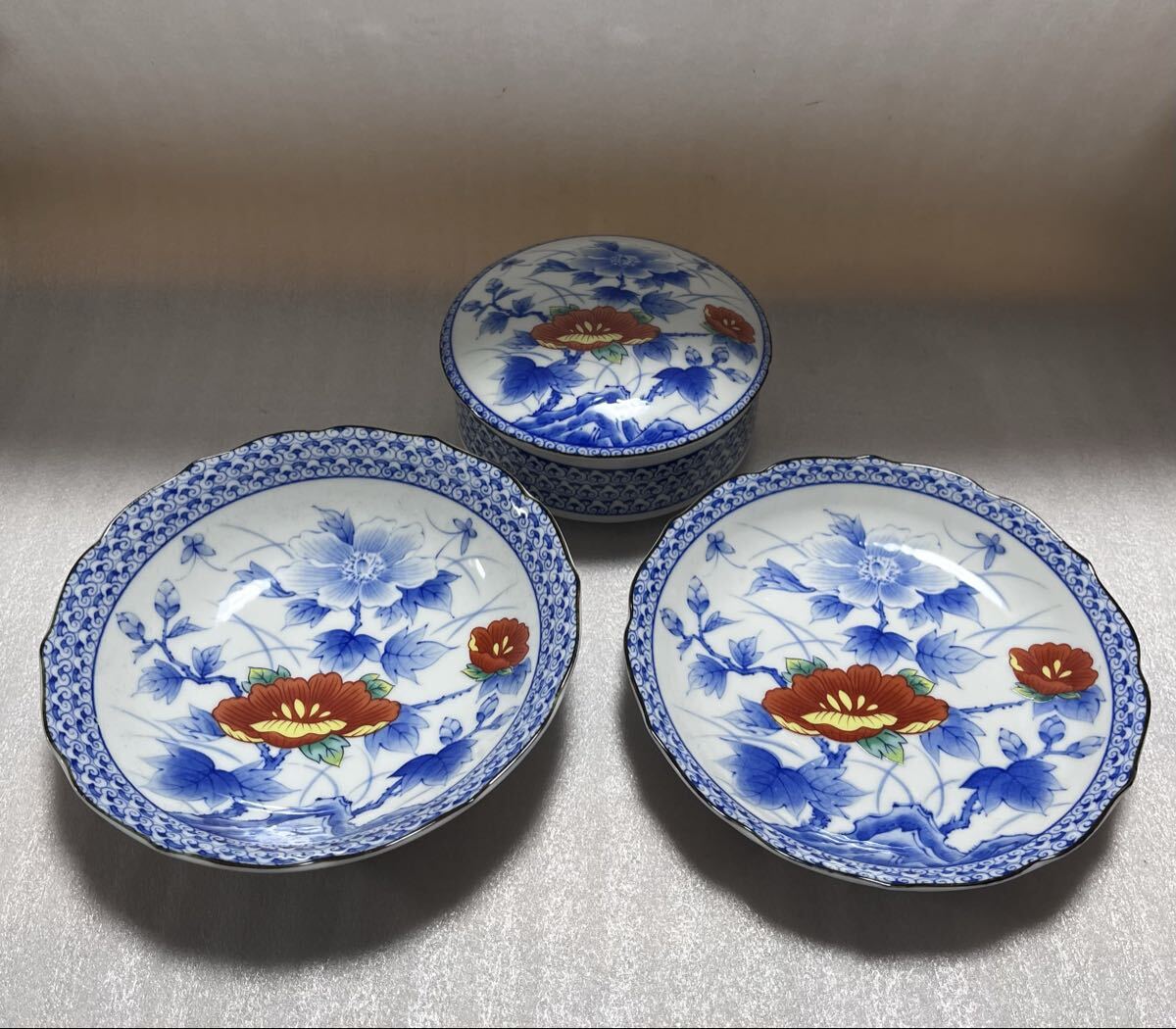 - 未使用 新品 有田焼 忍窯 中皿 浅鉢 深鉢 蓋付き鉢 和皿 中皿 色絵 花 蓋つき 小鉢 3個 3点 セット