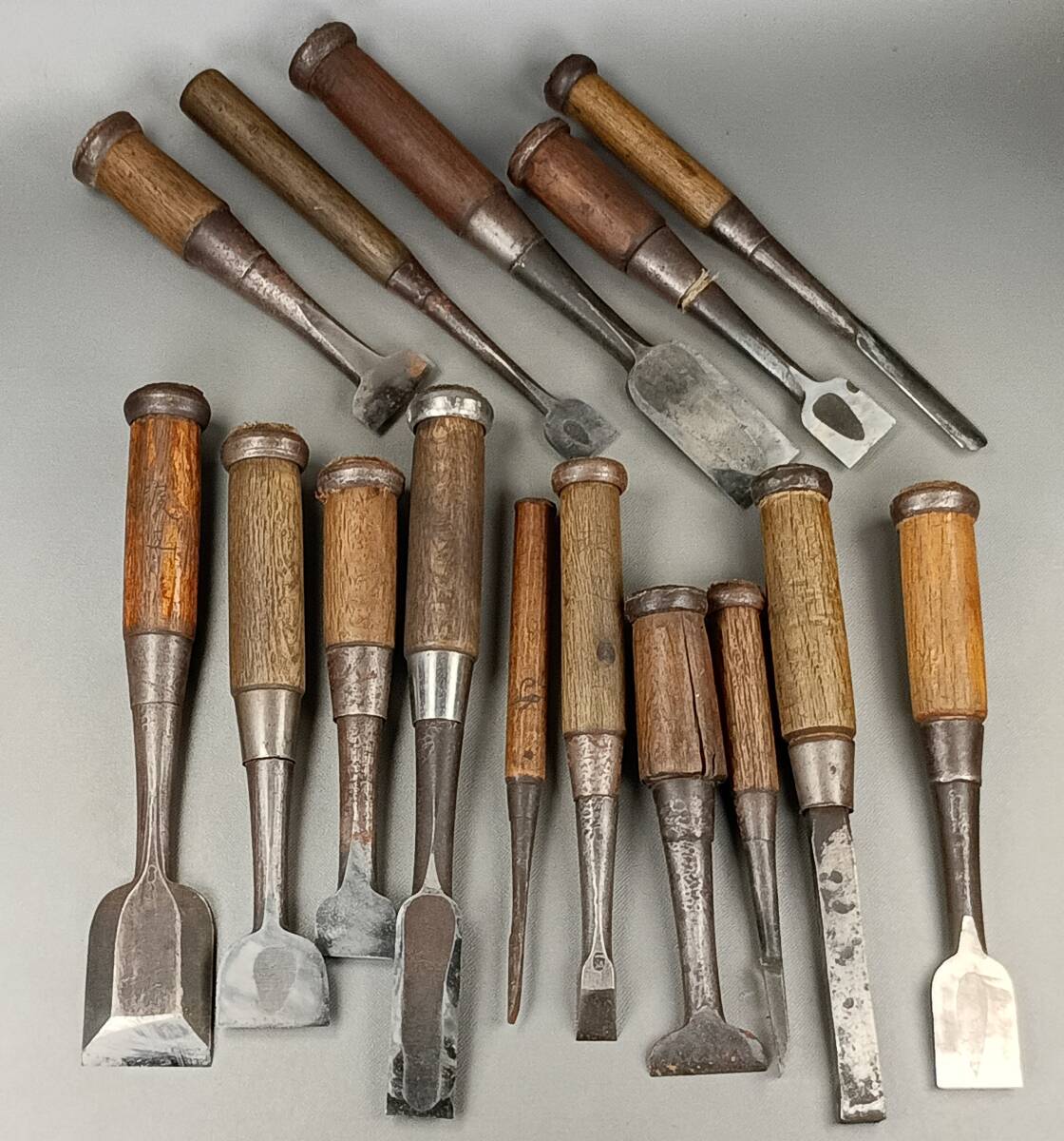 - 【偲】鑿 ノミ 職人 DIY 木製彫刻刀建築 古大工道具 15本セット 木製ハンドル 年代物 r-915