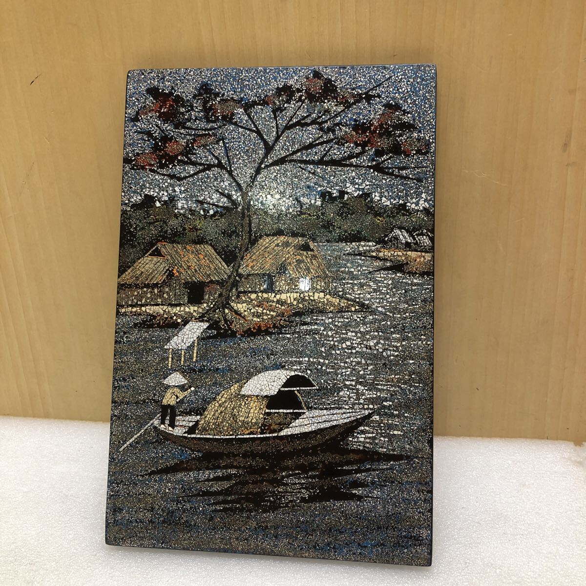 - TK5177 黒漆塗りのアジアの田舎の村のアートワーク、ヴィンテージの東洋のボートの水上の風景の吊り下げ絵画 高さ29cmX幅19cm 0928