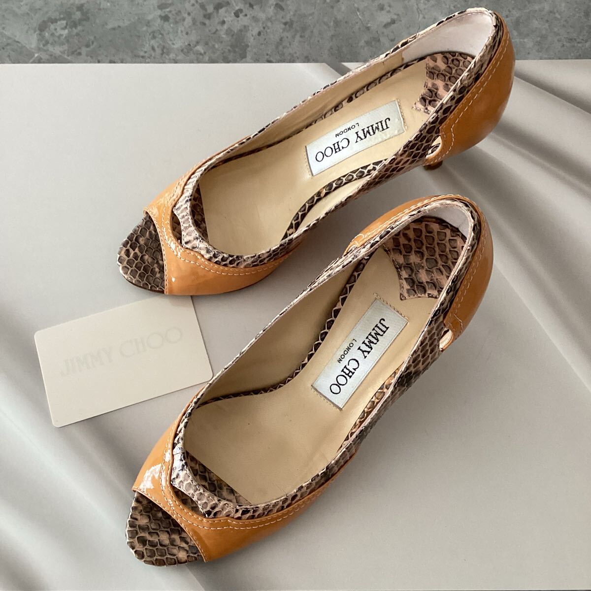 - JIMMY CHOO オレンジ ヘビ柄 オープントゥパンプス