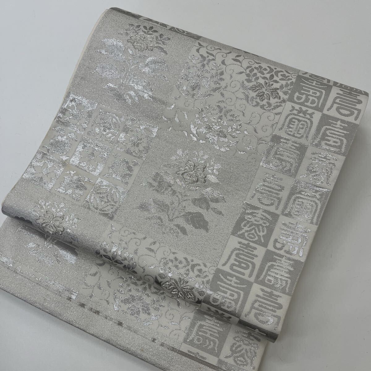 - 袋帯 市松に草花 銀彩 正絹 W-4466