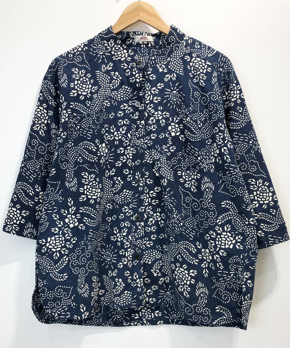- EDO-SAWAYA 藍染 バンドカラー シャツ 七分袖 胸ポケット付き 総柄 ネイビー エドサワヤ 古着 レトロ■0929H