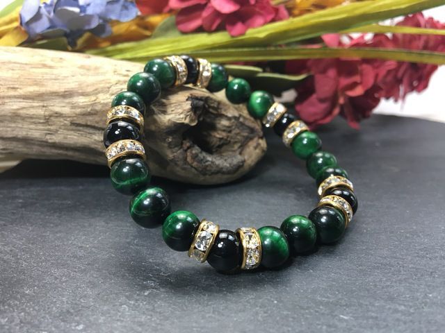 - グリーンタイガーアイ&オニキス パワーストーン ブレスレット 天然石ブレス (ゴールド) 開運 金運 仕事 リラックス 人間関係 レディース 緑