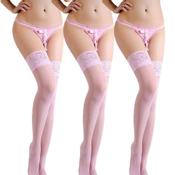 - ニーハイストッキング 太もも丈 花柄レース シリコンストッパー付き 15デニール レディース フリーサイズ ピンク 3足セット