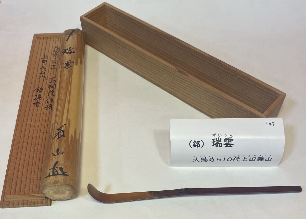 - 茶道具『煤竹 茶杓 銘「瑞雲」上田義山 花押 杓裏溜塗 白竹筒 書付有り共箱 美品 中節』上級品 茶の湯 茶事 茶会 茶杓 竹茶杓 大徳寺