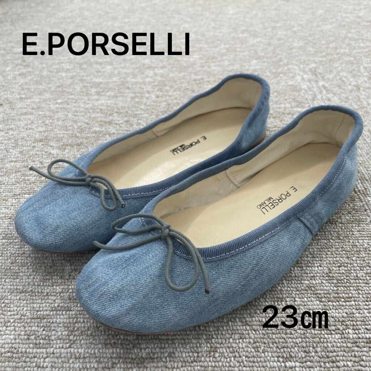 > 【764】 E.PORSELLI ポルセリ フラットシューズ デニム パンプス 水色 リボン バレエシューズ オープントゥ 表記サイズ36 23㎝