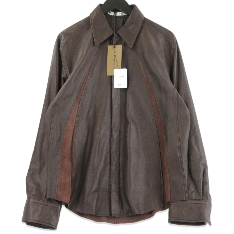 > 未使用 NVRFRGT ネヴァーフォーゲット 25AW レザーシャツ NF252S03 LEATHER PANELED LONG SLEEVE SHIRT ブラウン 2 タグ付き 70016964