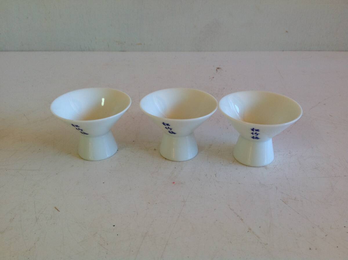 - *白い円 錐形 お猪口 酒器 3個セツト 青い文字装飾 中古品/現状品*