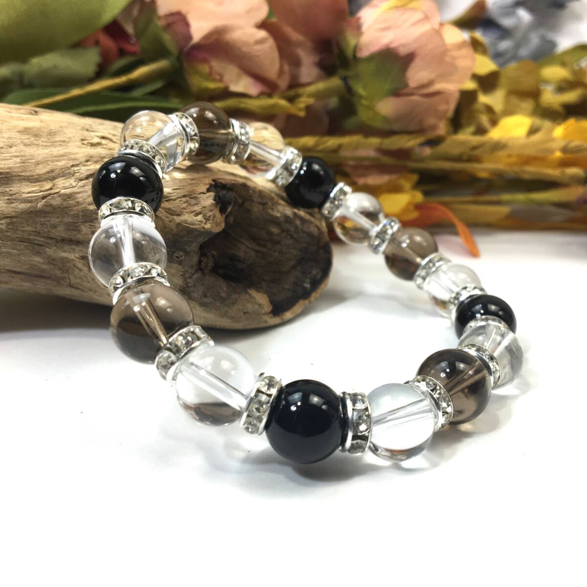 - スモーキークォーツ×水晶×オニキス パワーストーン ブレスレット 天然石ブレス (ロンデル: シルバー) 10mm メンズ・レディース
