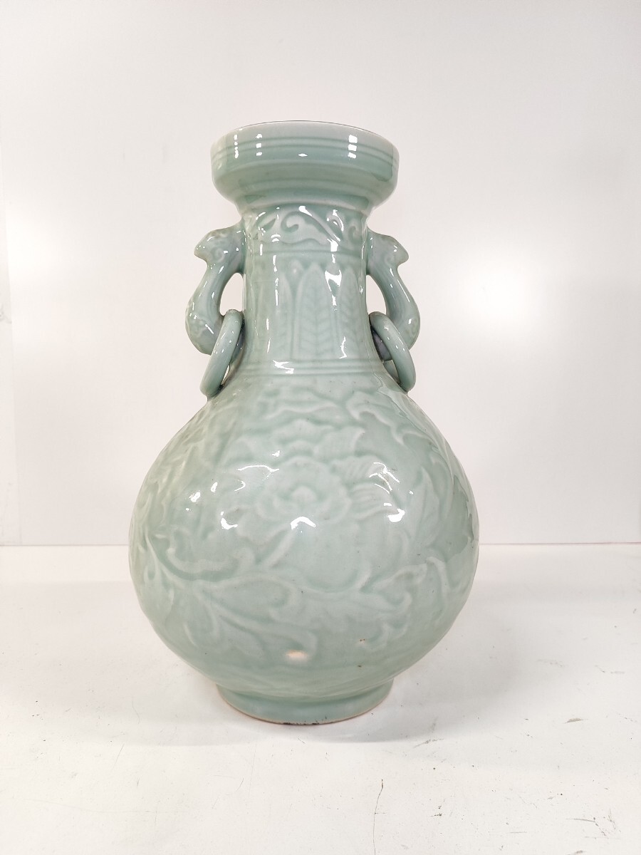 - k139 中国龍泉窯 牡丹文青磁 龍泉 双耳 花器 花瓶 壷 花入 陶器 中国古玩