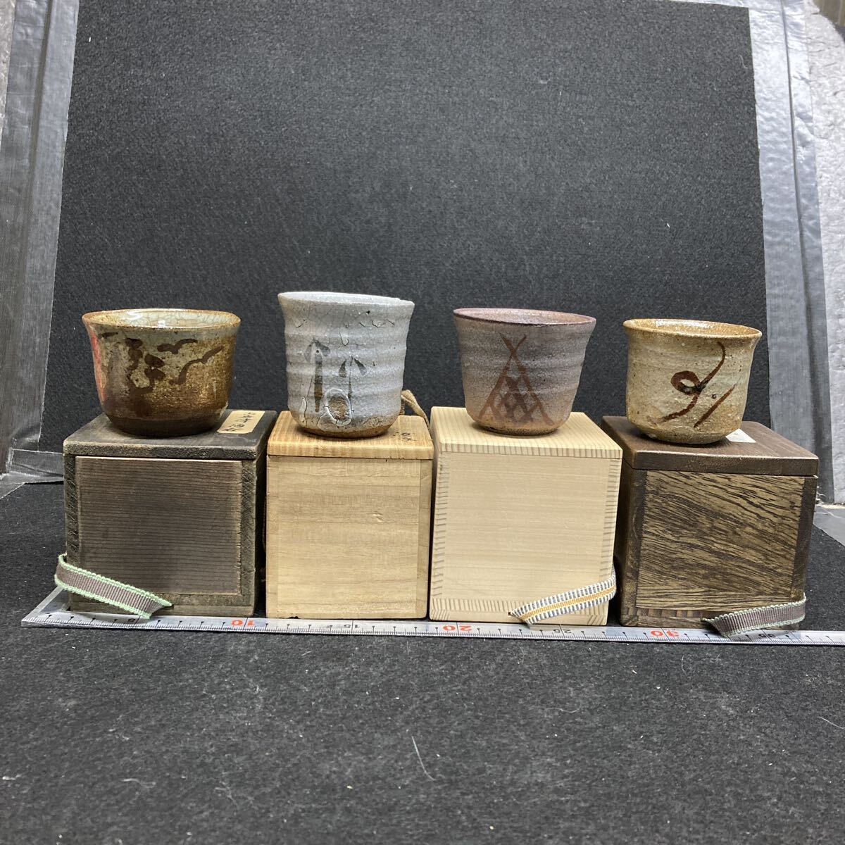- 唐津焼き 絵唐草 ぐい呑み 四点合い箱付き アンテーク