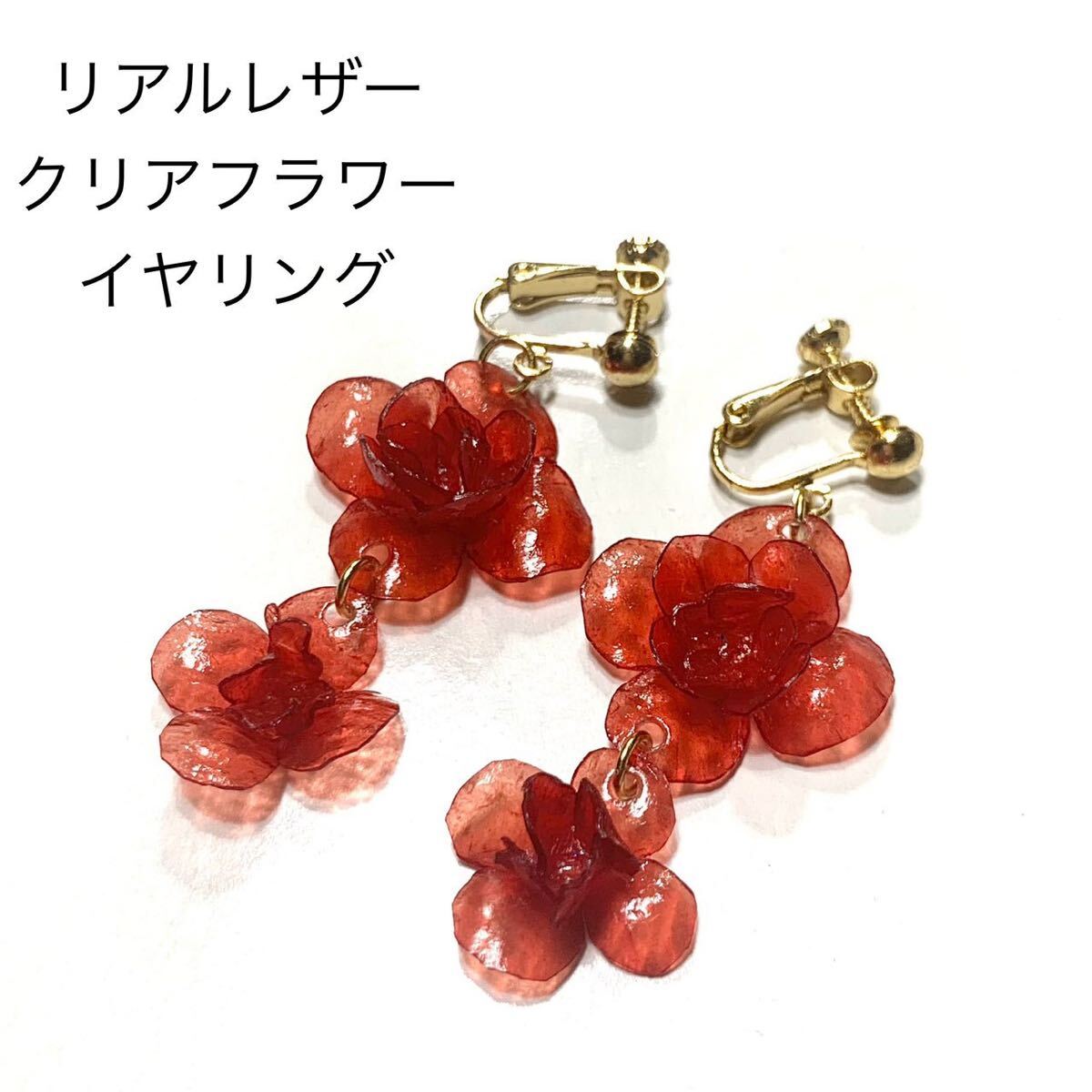 - 新品未使用 本革シースルーレザーフラワーイヤリング ピンクレッド 赤 成人式 振袖 ふりそで 和装 着物 きもの ゆかた 浴衣