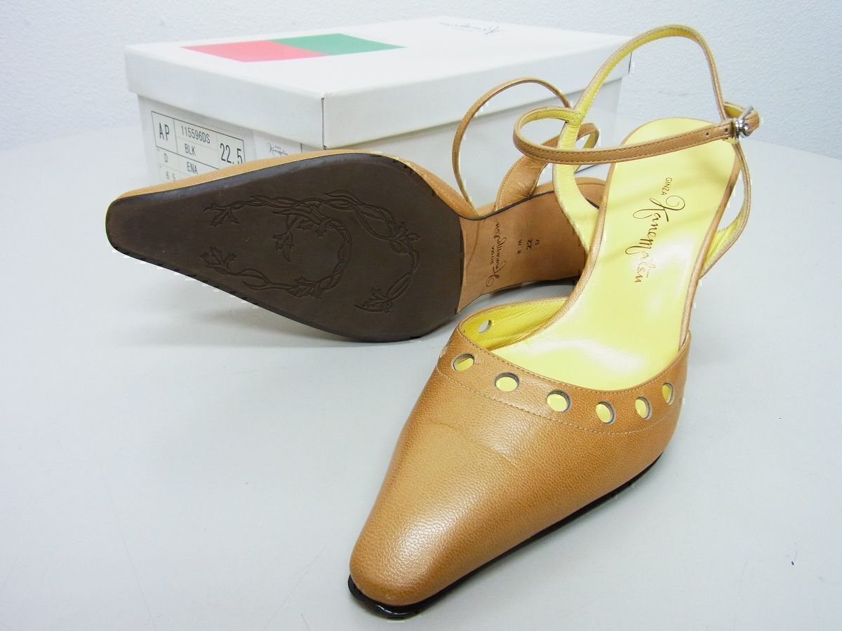 > ★美品★GINZA Kanematsu 銀座かねまつ★アンクルストラップとんがりサンダル★22cm【RM22D】キャメル黄土色【本物保証】中古品
