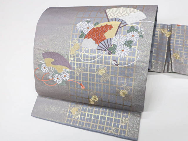 - 《京都一輝堂》リサイクル着物 九寸名古屋帯 六通柄 花扇 正絹 25b09-1829