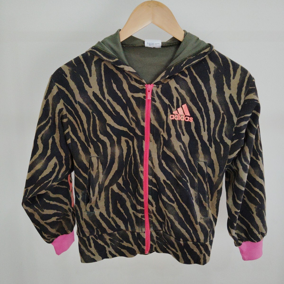 - 1001/130/ adidas キッズ ジップパーカー ジャケット アニマル柄 ロゴ刺繍 ラメ カーキ
