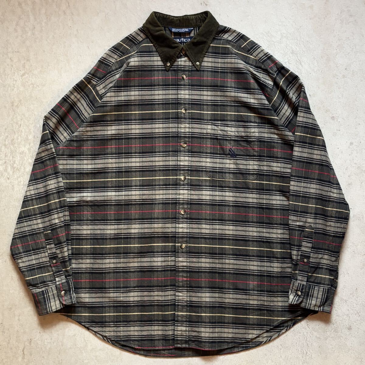 > 【90s】NAUTICA ノーティカ ボタンダウン 長袖 フランネルシャツ コットン メンズ XL オリーブ チェック 襟コーデュロイ VINTAGE 正規品