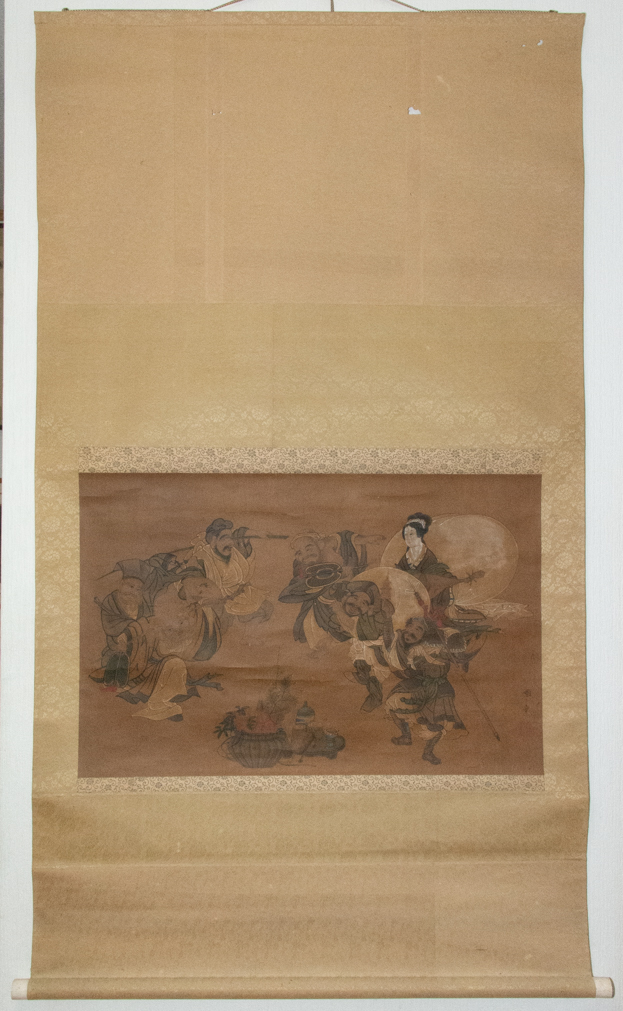 - 【模写】在銘 古画 七福神 鶴亀 鯛 松竹梅 掛軸 縁起物 古玩 書画 仏画 日本画