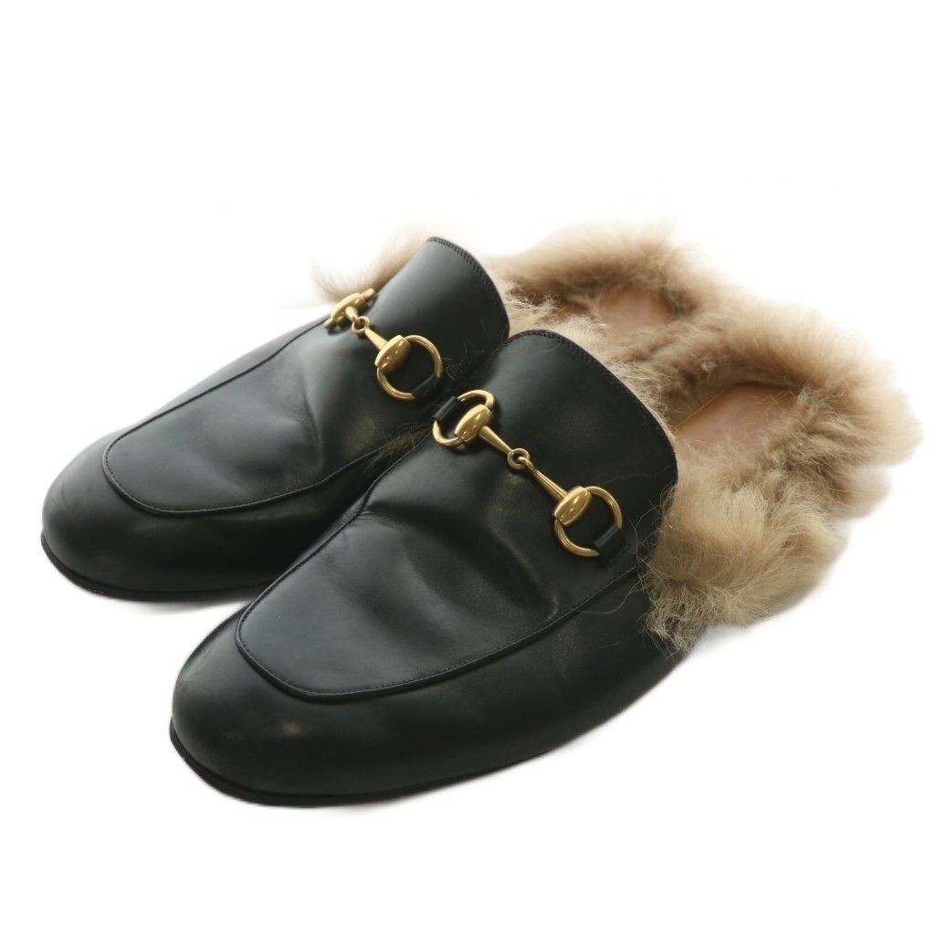 - グッチ GUCCI プリンスタウン Princetown サンダル スリッパ ローファー レザー ファー ホースビット ゴールド金具 黒 ブラック