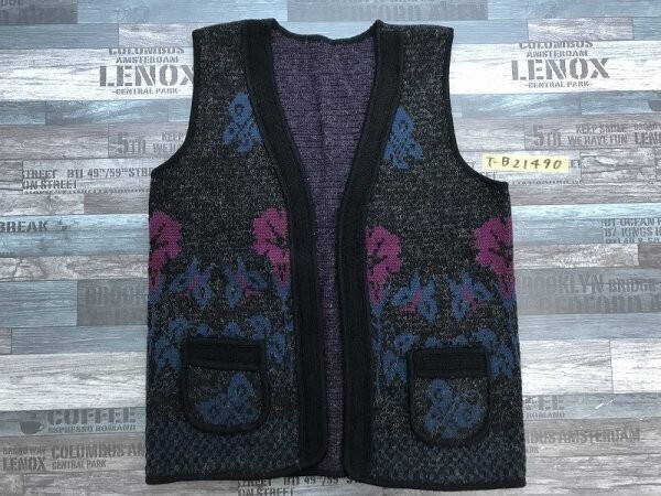 - 美品!レディース ウールミックス ボタニカル・蝶柄 前開き レトロ ニットベスト 黒ボルドー青