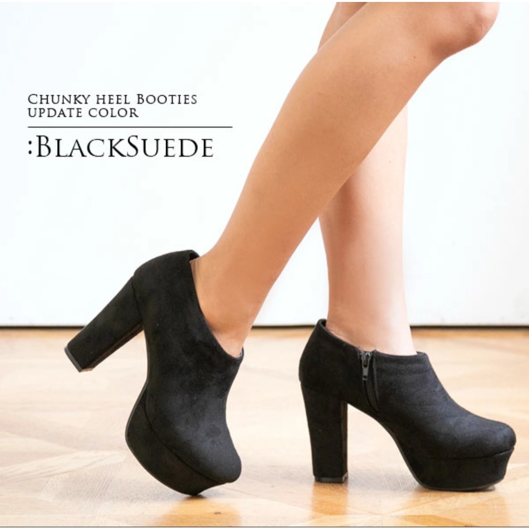 > ショートブーツ 黒 スエード 24.5cm 太ヒール 10.5cm 美脚ブーティー 内側ファスナー付き 歩きやすい レディース 靴 クッションインソール