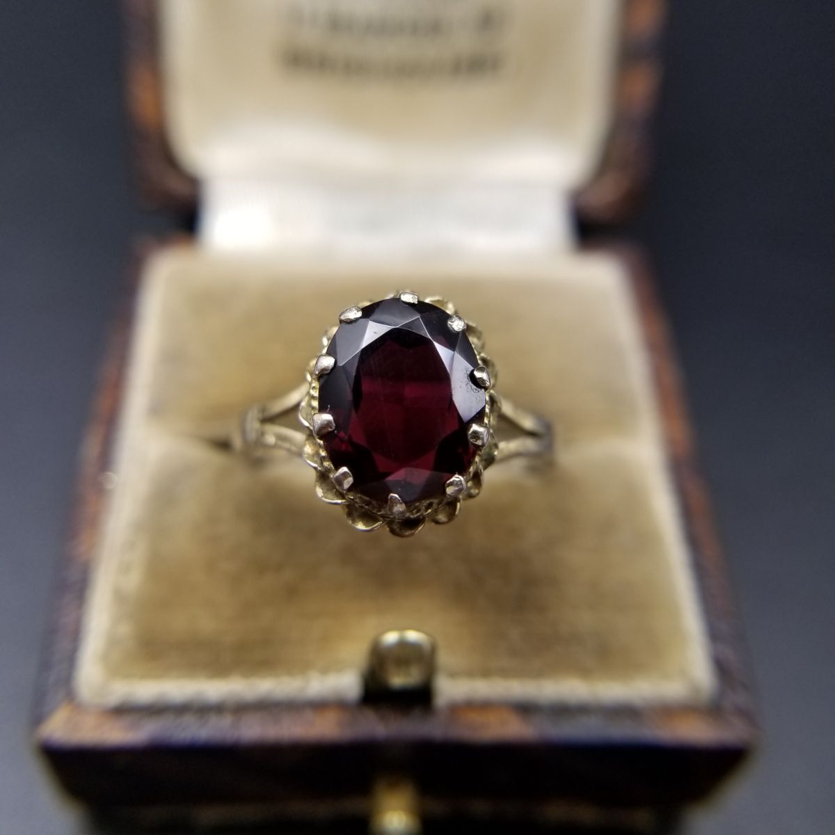 > 1980年 英国 ヴィンテージ ガーネット オーバル ファセット 925 シルバー リング 指輪 銀 ゴールドプレート London ホールマーク R16-R