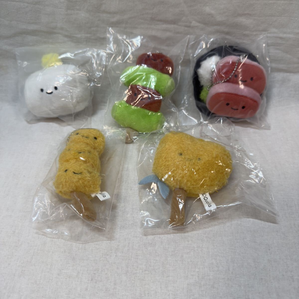 - 送料無料 にっこりーノ 居酒屋 串カツのぬいぐるみ 5種セット ☆ クオリア マスコット ボールチェーン ひややっこ やきとり うずら アジ
