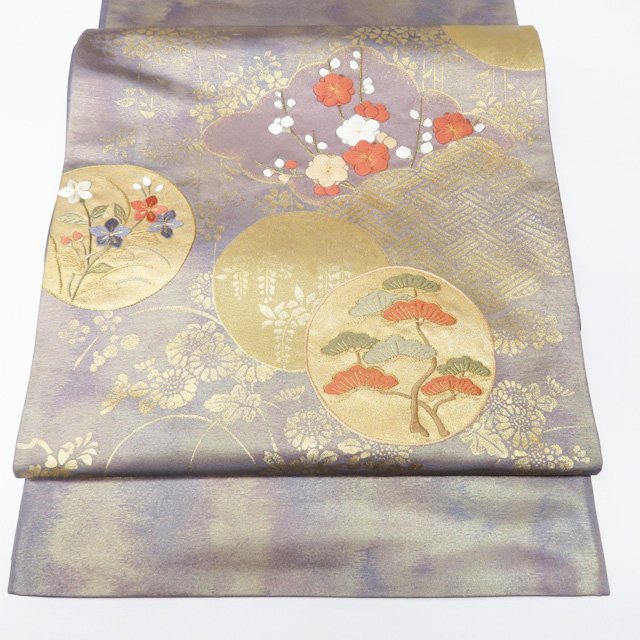 - ★きもの北條★ 刺繍 植物文様 松 梅 桔梗 雲 引箔 お太鼓柄 仕立て上がり 中古 正絹 袋帯 T797-12