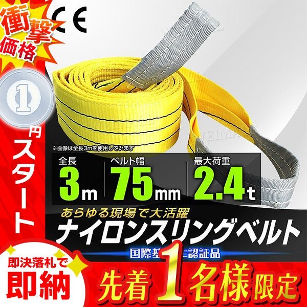 > 1円 スリングベルト 耐荷重2400kg 2.4t 長さ3m×幅75mm アイ型 ナイロン ベルト スリング 吊り 荷揚 ベルト 資材 玉掛け 牽引 新品