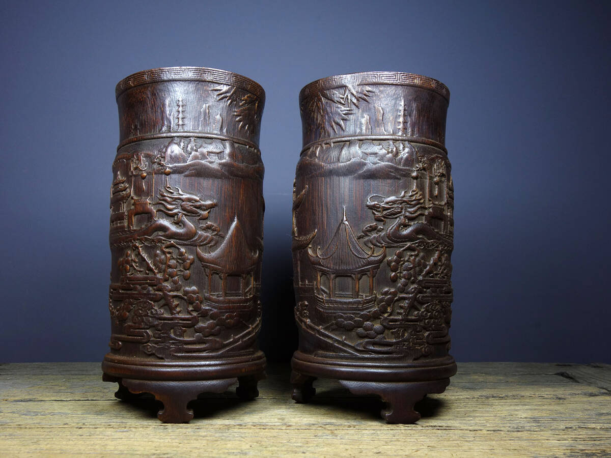 - 【蔵友館蔵品・竹材製・細密彫・樓臺亭閣紋・筆筒・置物・文房賞物】・古董品・中国古玩・時代物・希少珍品・中国時代美術