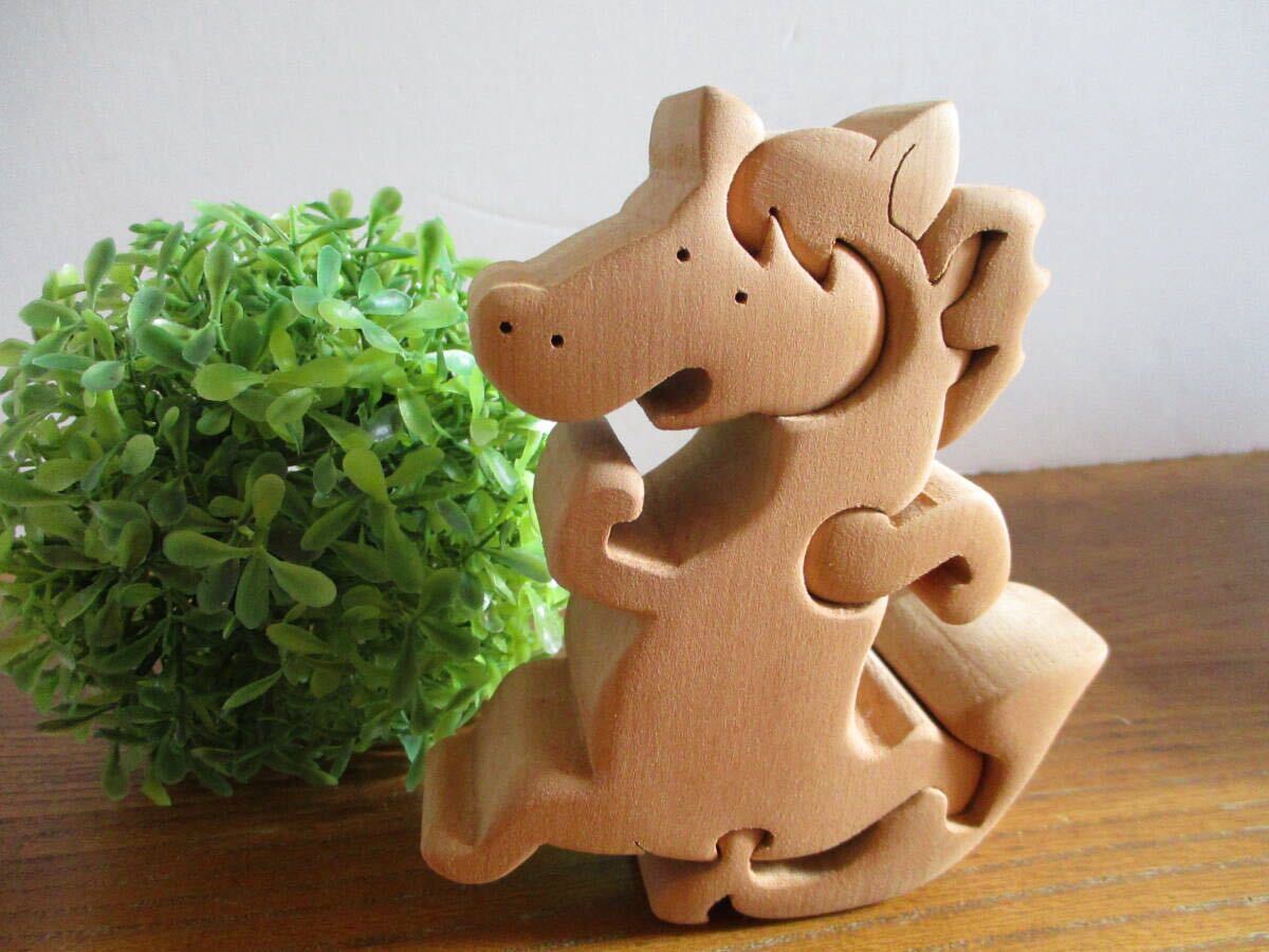 > 【ほぼ未使用・激レア】千葉圭介 手作り木製パズル クラフトバードウッド 立体式パズル 干支置物 午 馬 ウマ 北海道産/桂材 知育玩具 希少