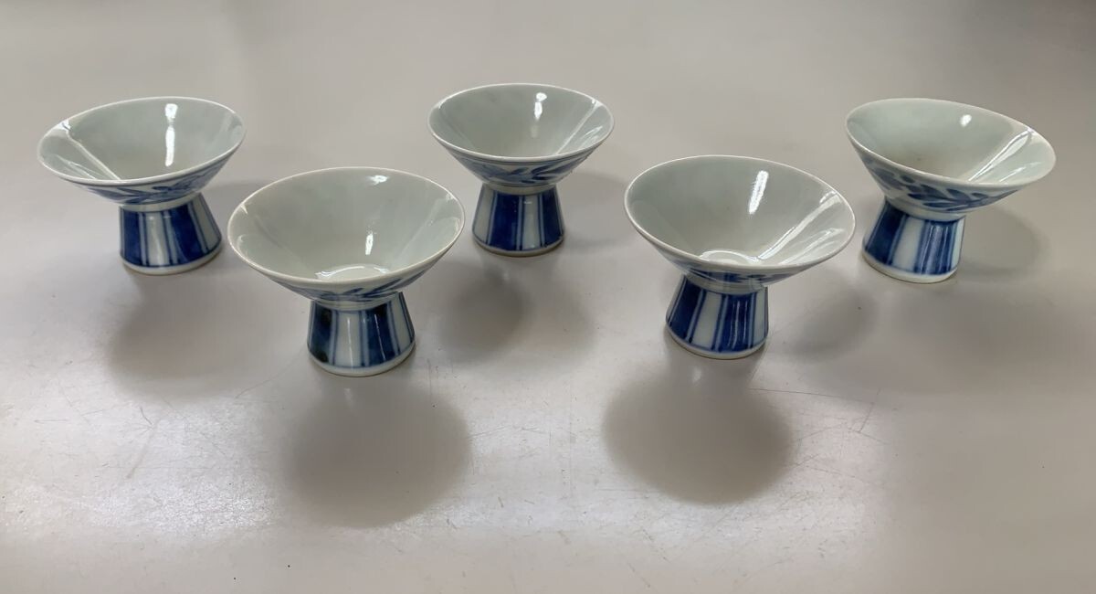 - G0305→正斎造 杯 酒器 5客 正斎 高足杯 馬上杯 染付 カップ 盃 時代物